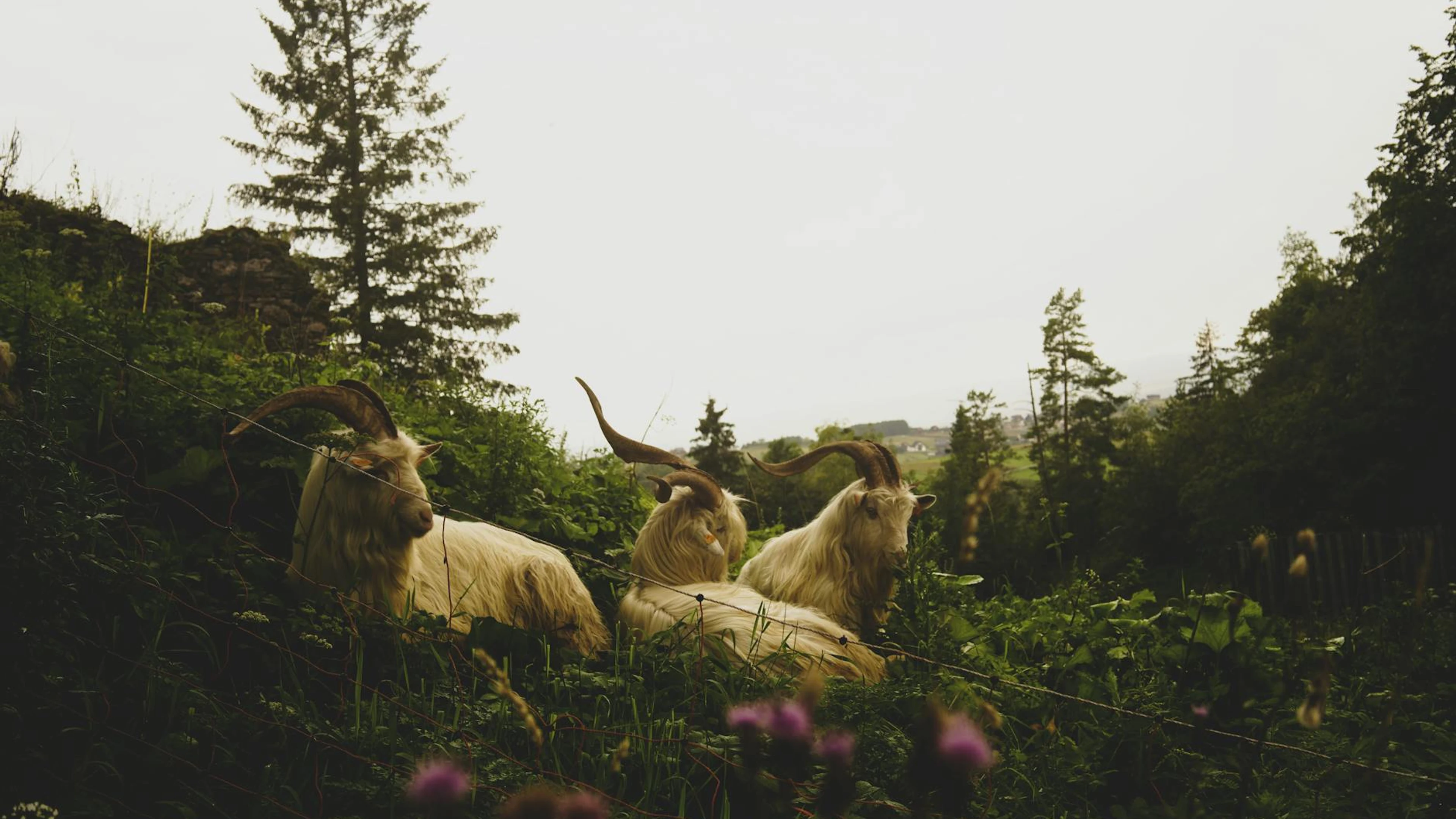 Download Three majestic goats resting among lush greenery in a serene forest setting. wallpaper for free. 3840x2160 4K Ultra HD resolution, perfect for your desktop. High quality nature wallpaper.