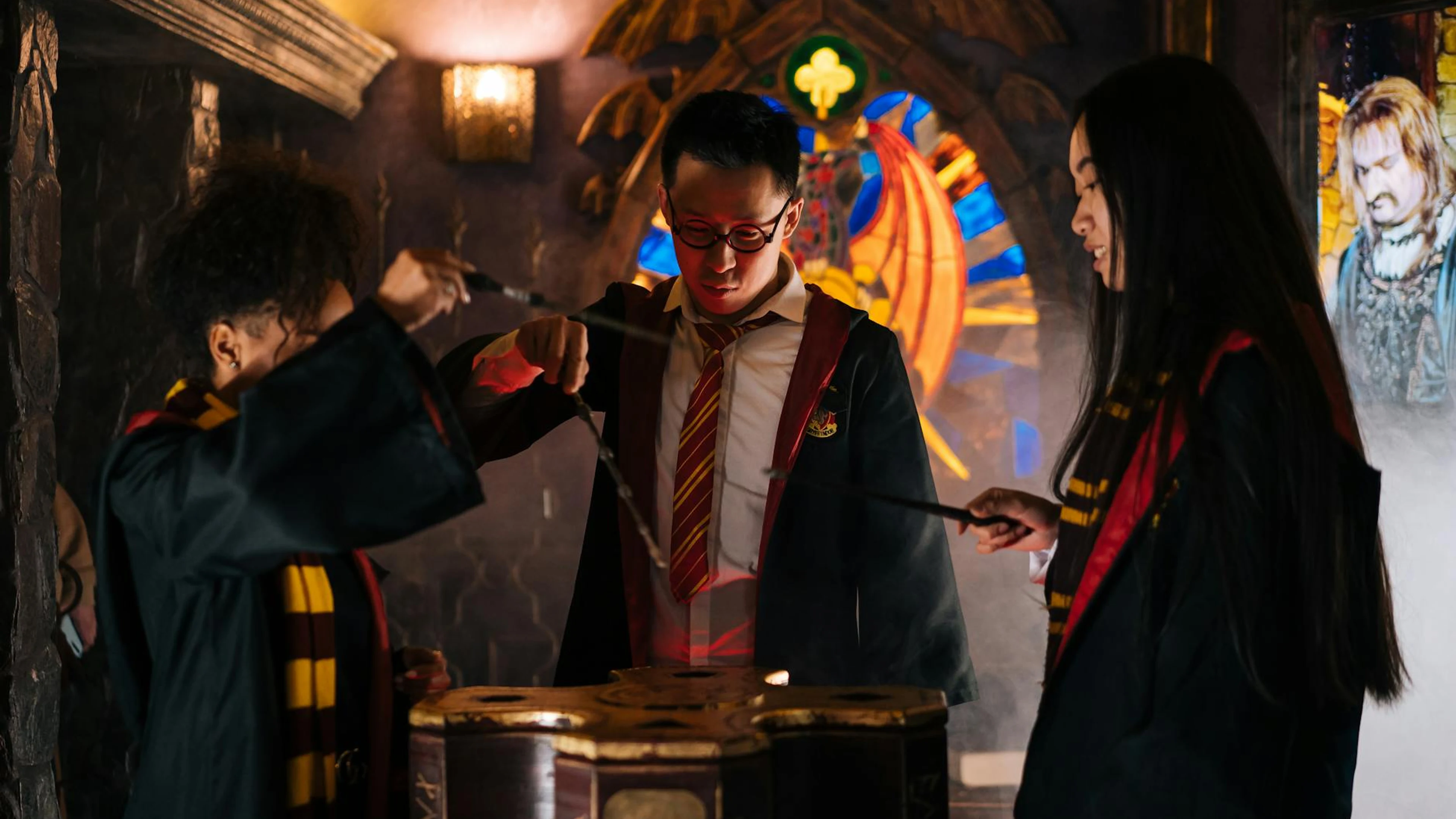 Three young wizards in robes and scarves casting spells with wands in a mystical