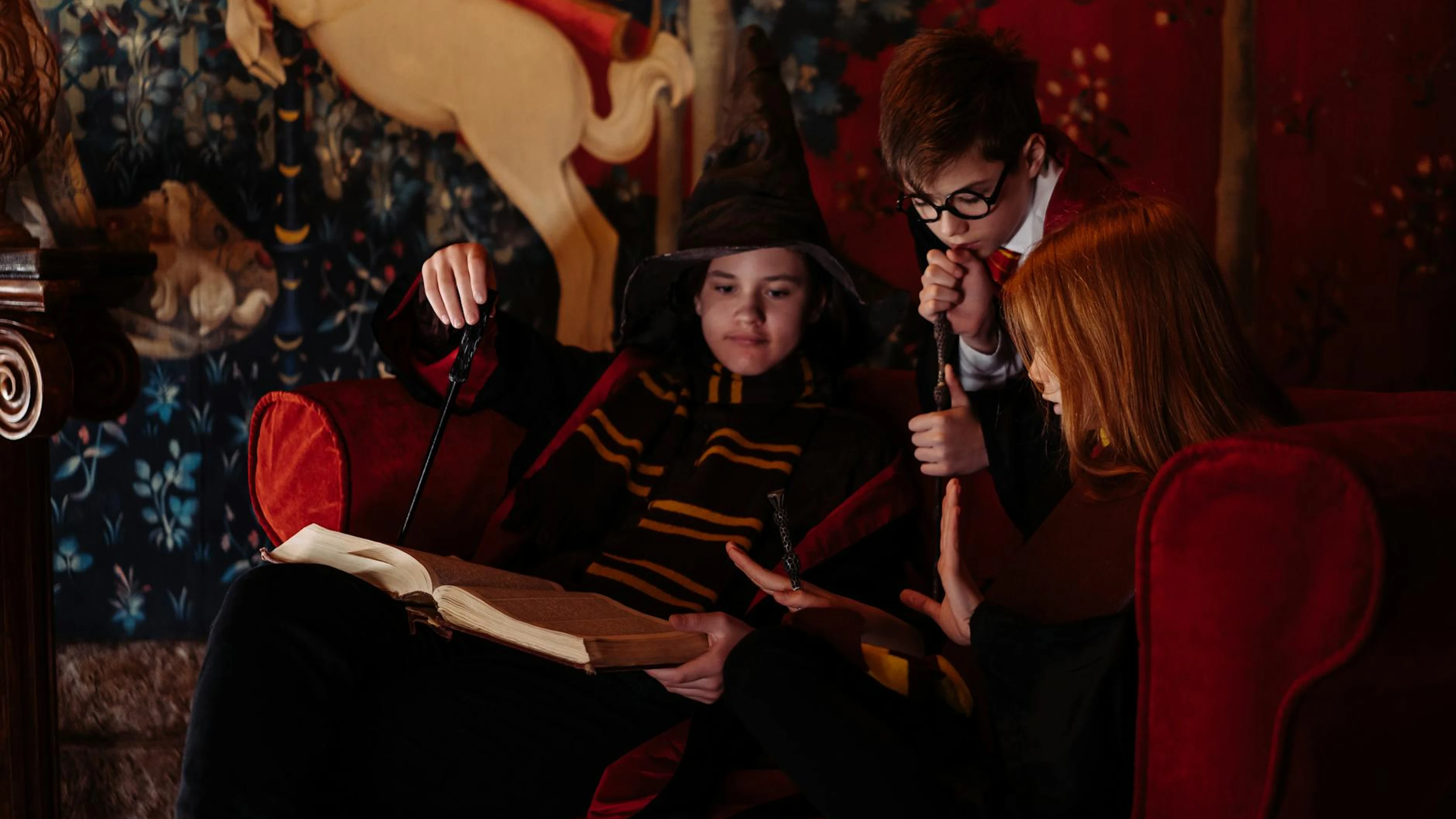 Get this stunning Three young wizards practicing magic spells with wands and books in a cozy, fant wallpaper in 4K Ultra HD quality. 3840x2160 fantasy wallpaper available for free download.