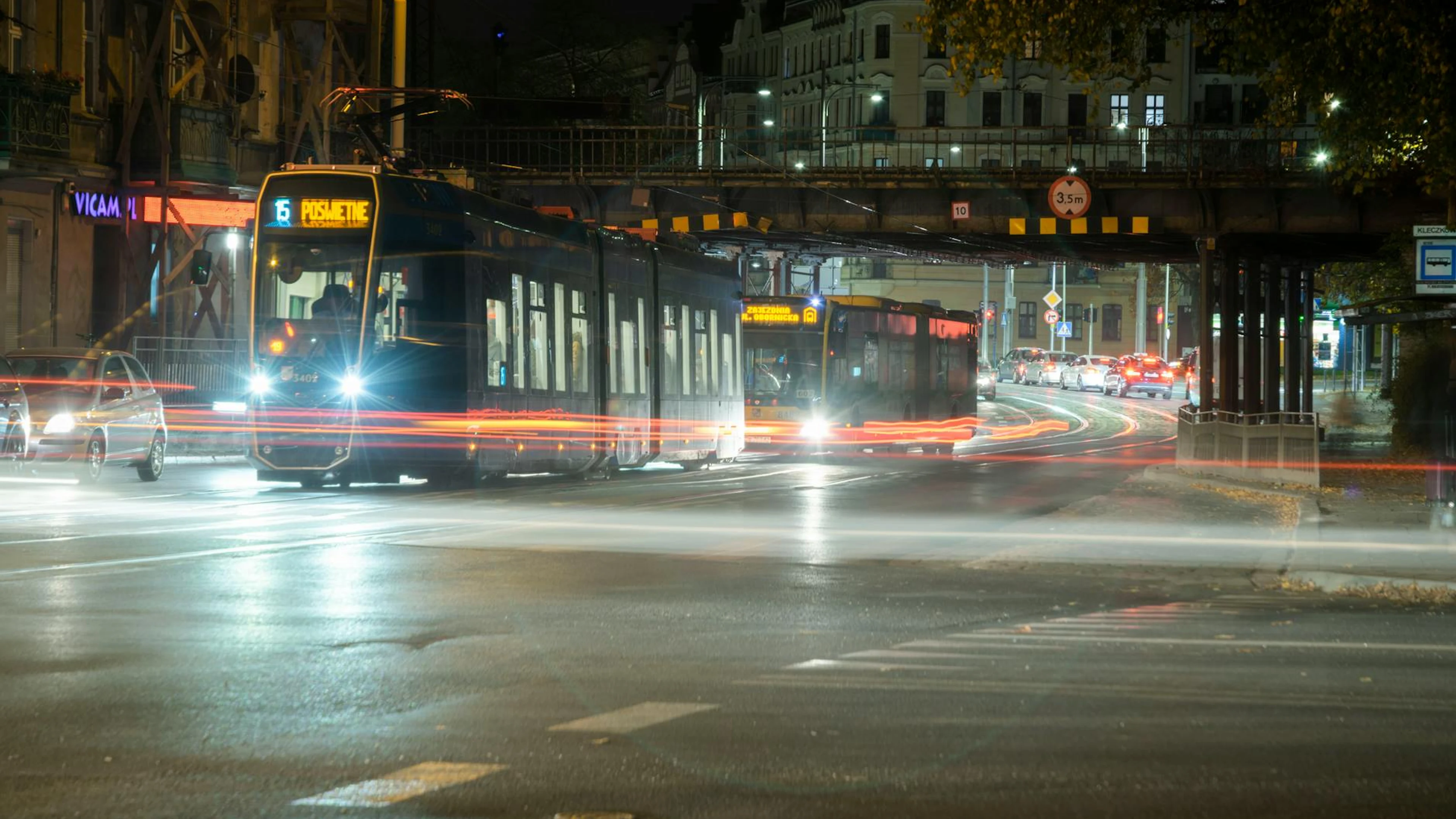 Tram moving at night with light trails in a bustling city street under a bridge.