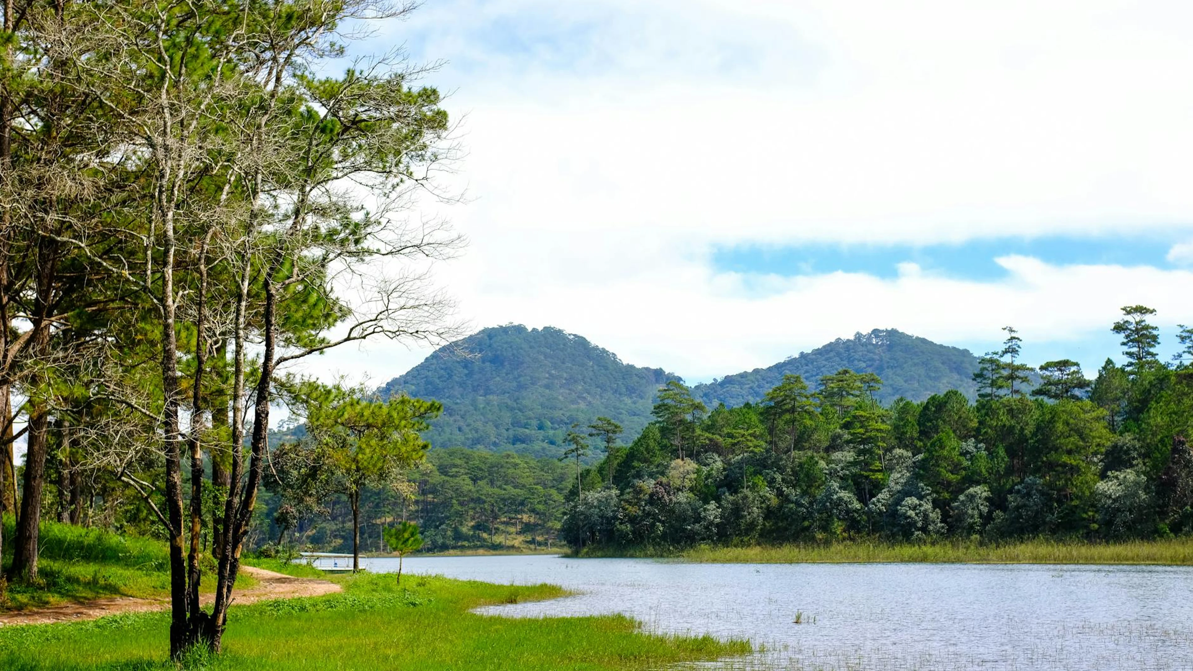 Get this stunning Tranquil mountain lake surrounded by lush green forests and hills under a clear wallpaper in 4K Ultra HD quality. 3840x2160 lake wallpaper available for free download.