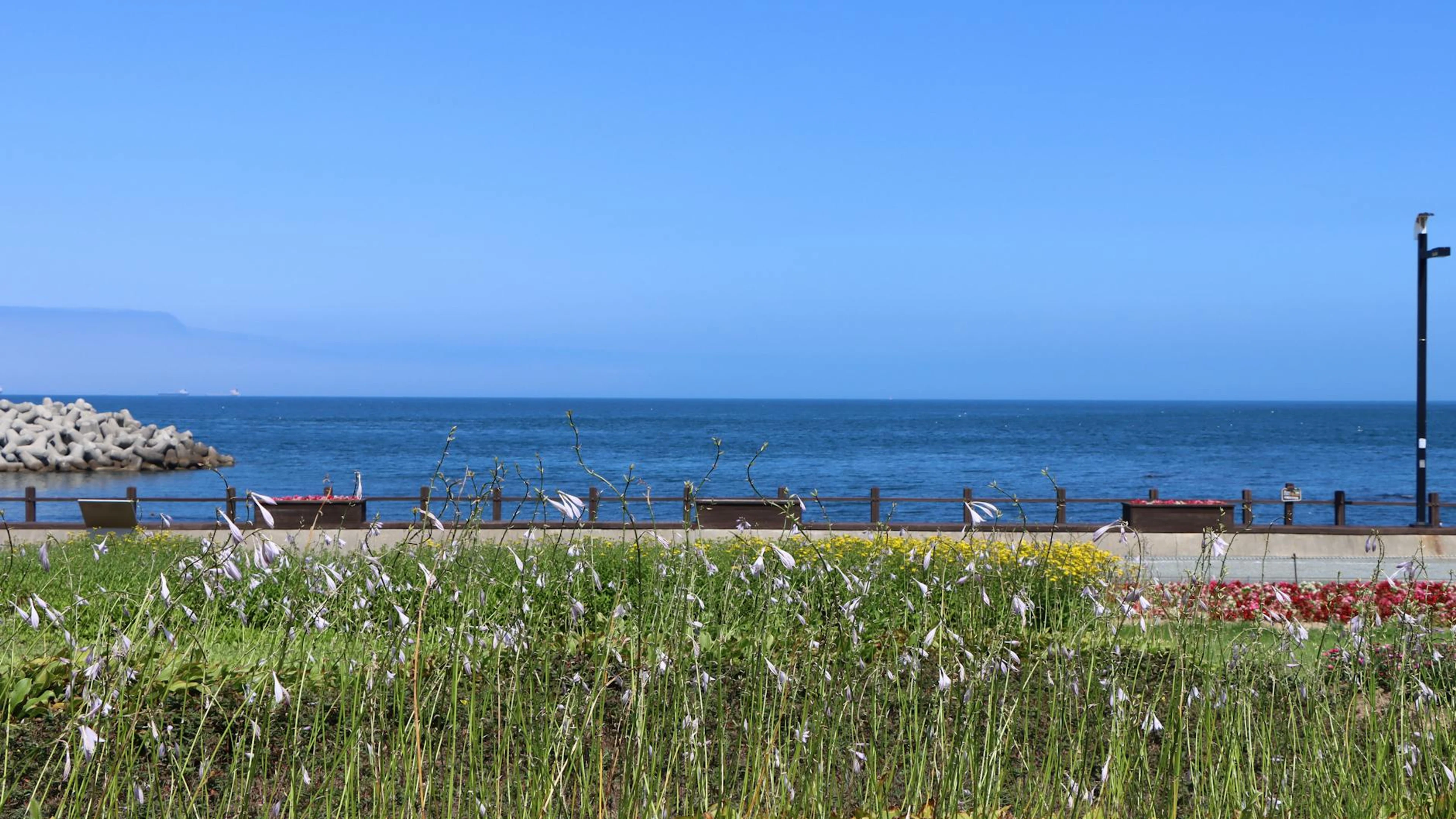 Tranquil seaside scene with blue sky, ocean, and vibrant flower beds.
