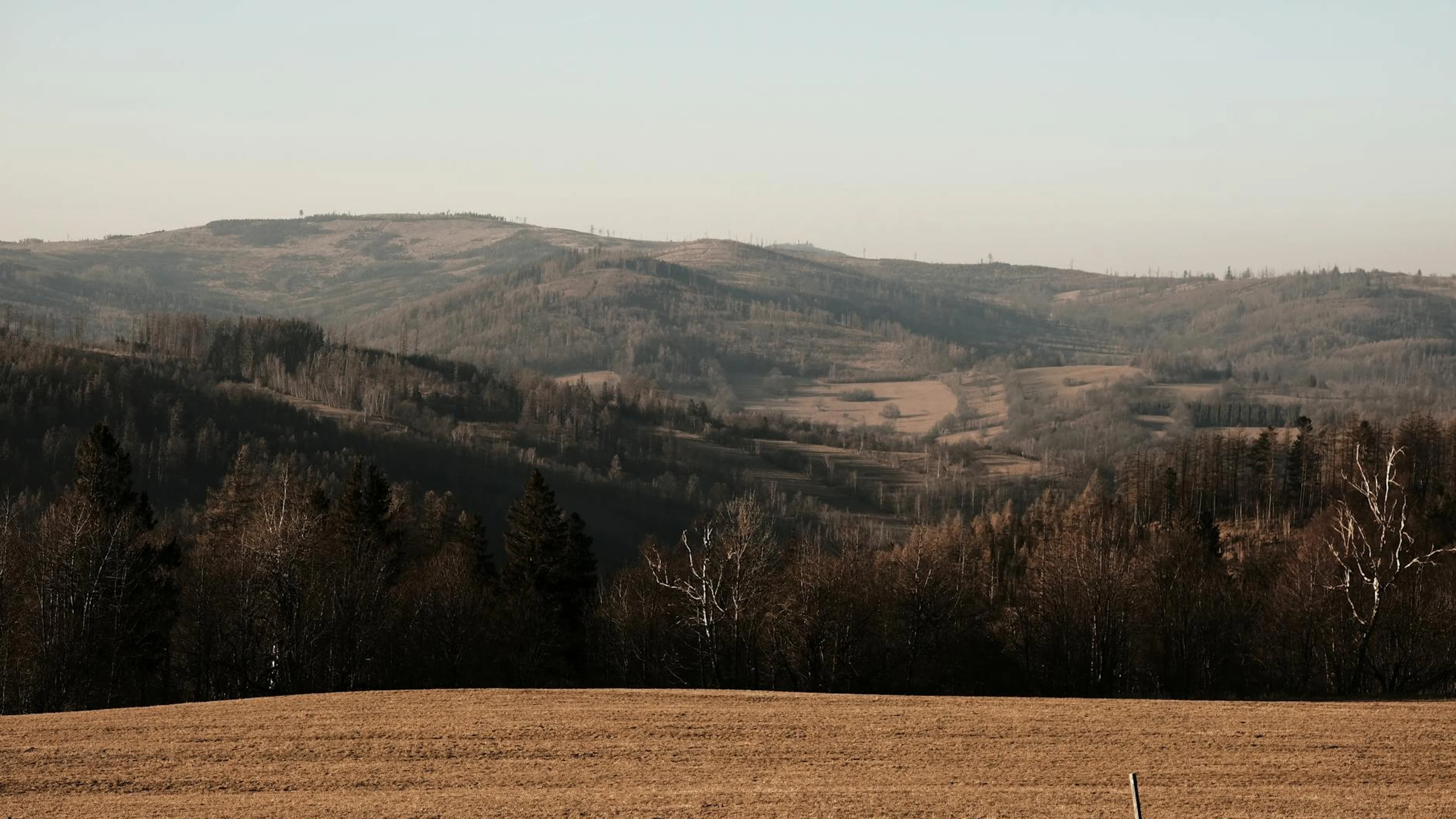 Tranquil view of rolling hills and forested mountains under a clear sky.