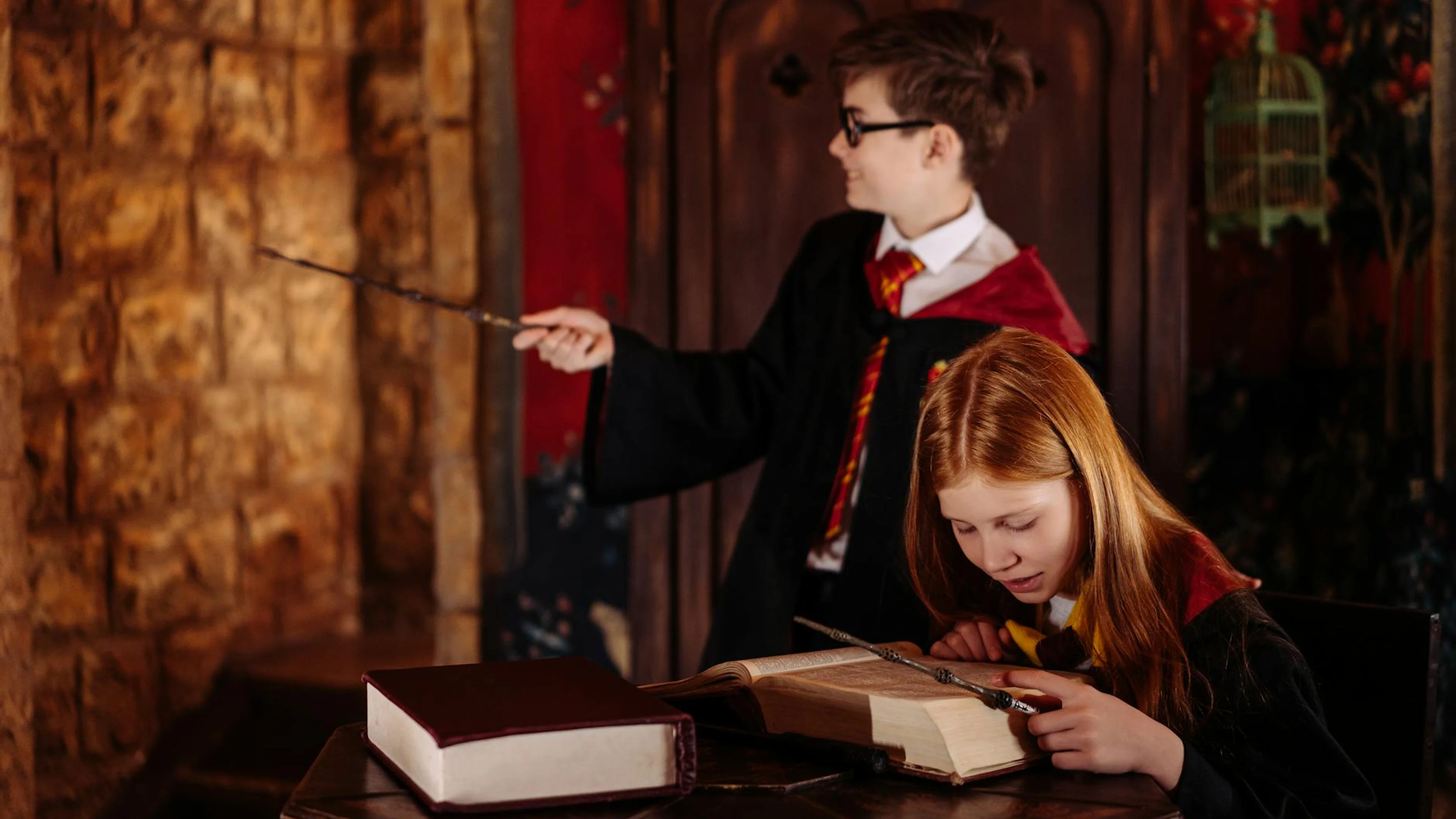 Free Two children dressed as wizards using magic wands and reading a spell book indoo wallpaper in 4K Ultra HD resolution (3840x2160). Beautiful fantasy background for your screen. No signup required.