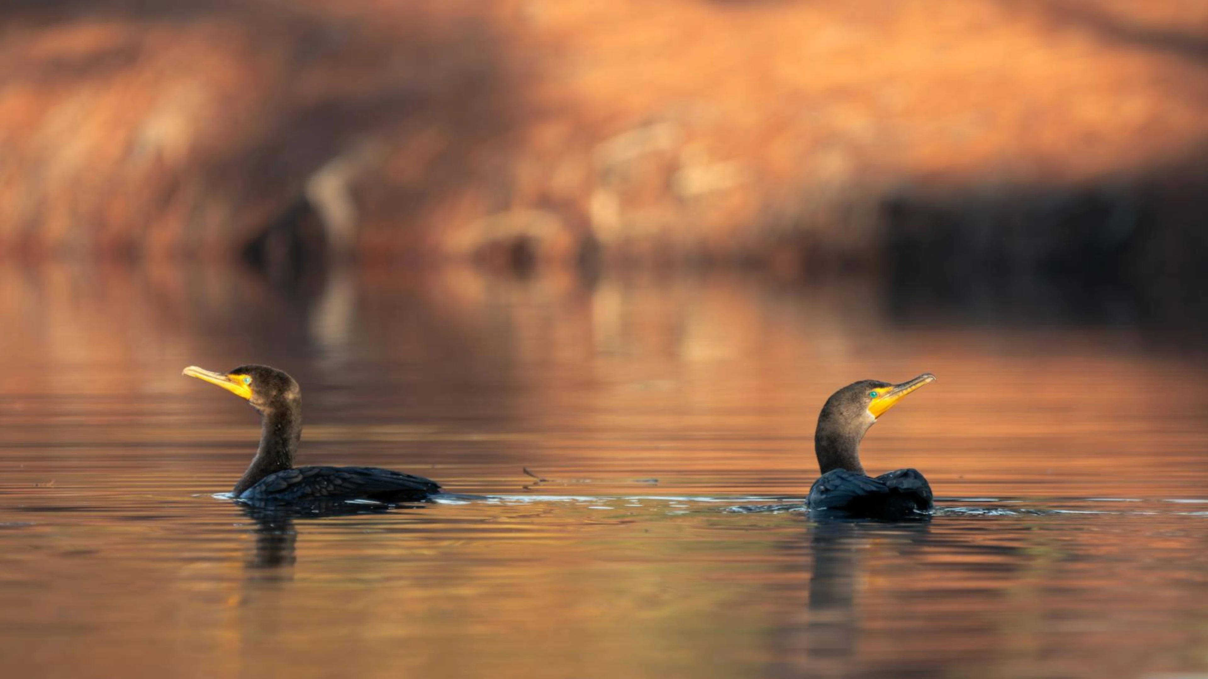 Free Two cormorants gracefully swim on a lake with autumn reflections. wallpaper in 4K Ultra HD resolution (3840x2160). Beautiful animals background for your screen. No signup required.