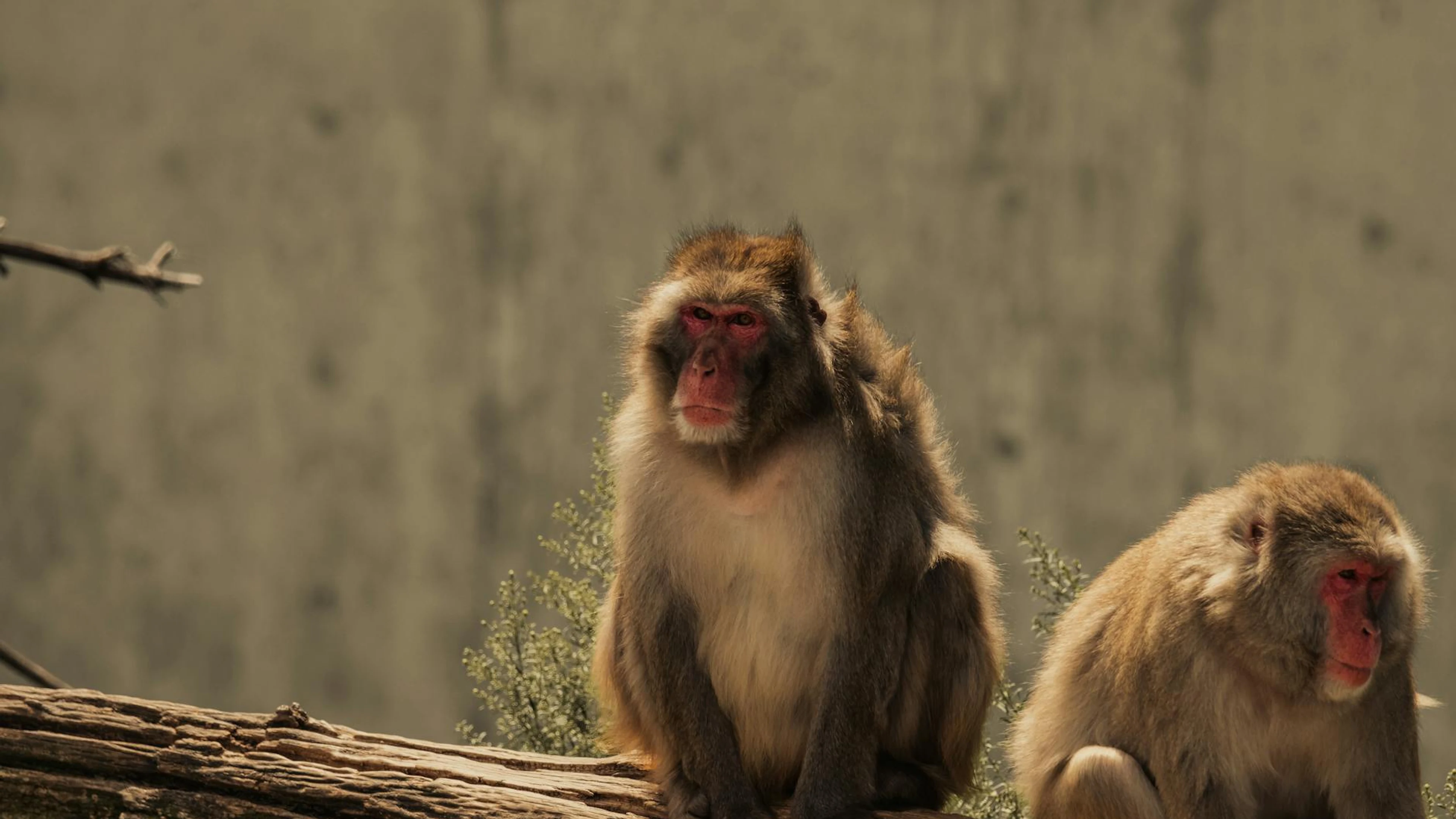 Free Two Japanese macaque monkeys sitting on a log against a neutral background. wallpaper in 4K Ultra HD resolution (3840x2160). Beautiful anime background for your screen. No signup required.