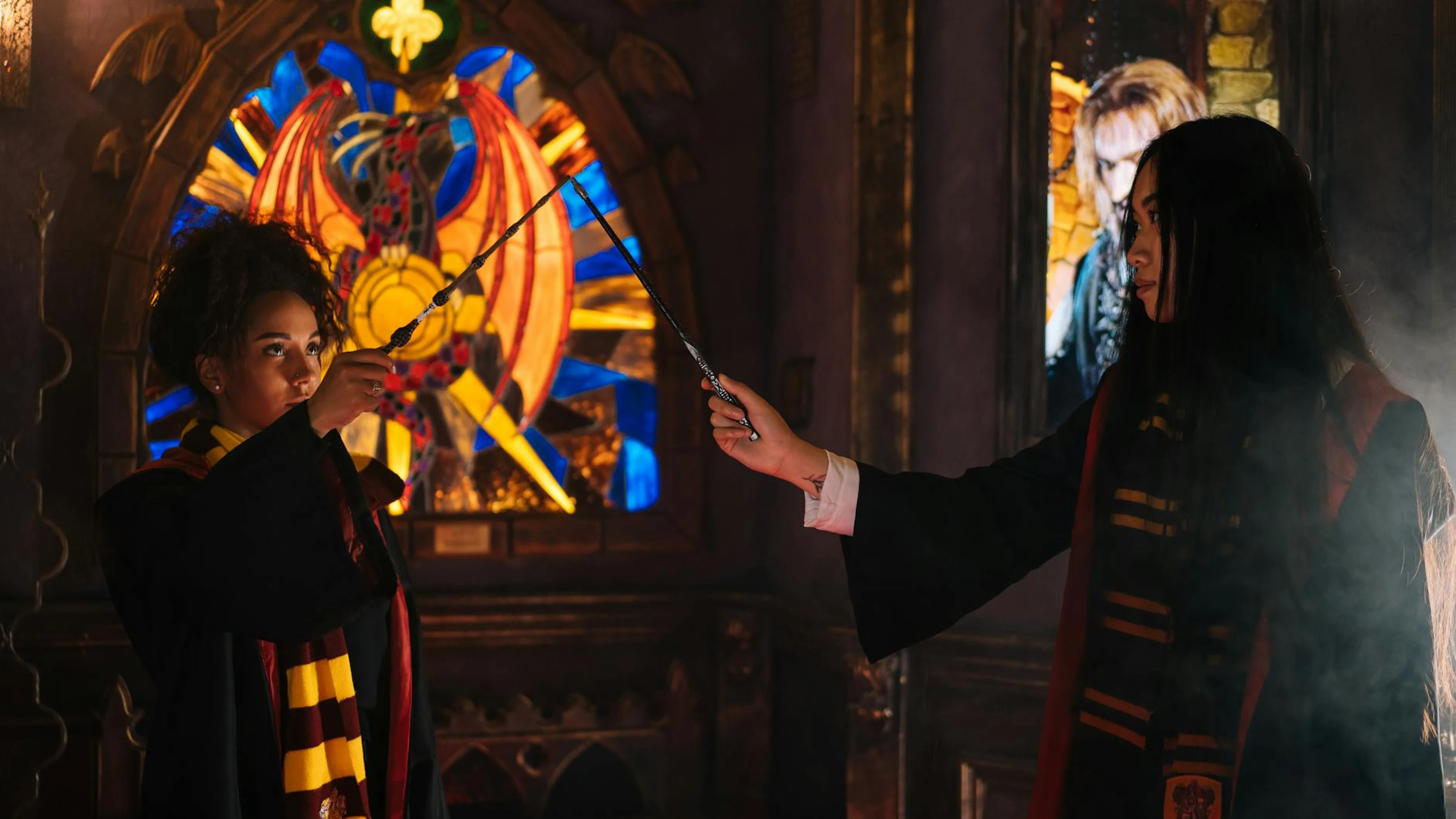 Two young women dressed in wizarding robes duel with wands in a mystical setting