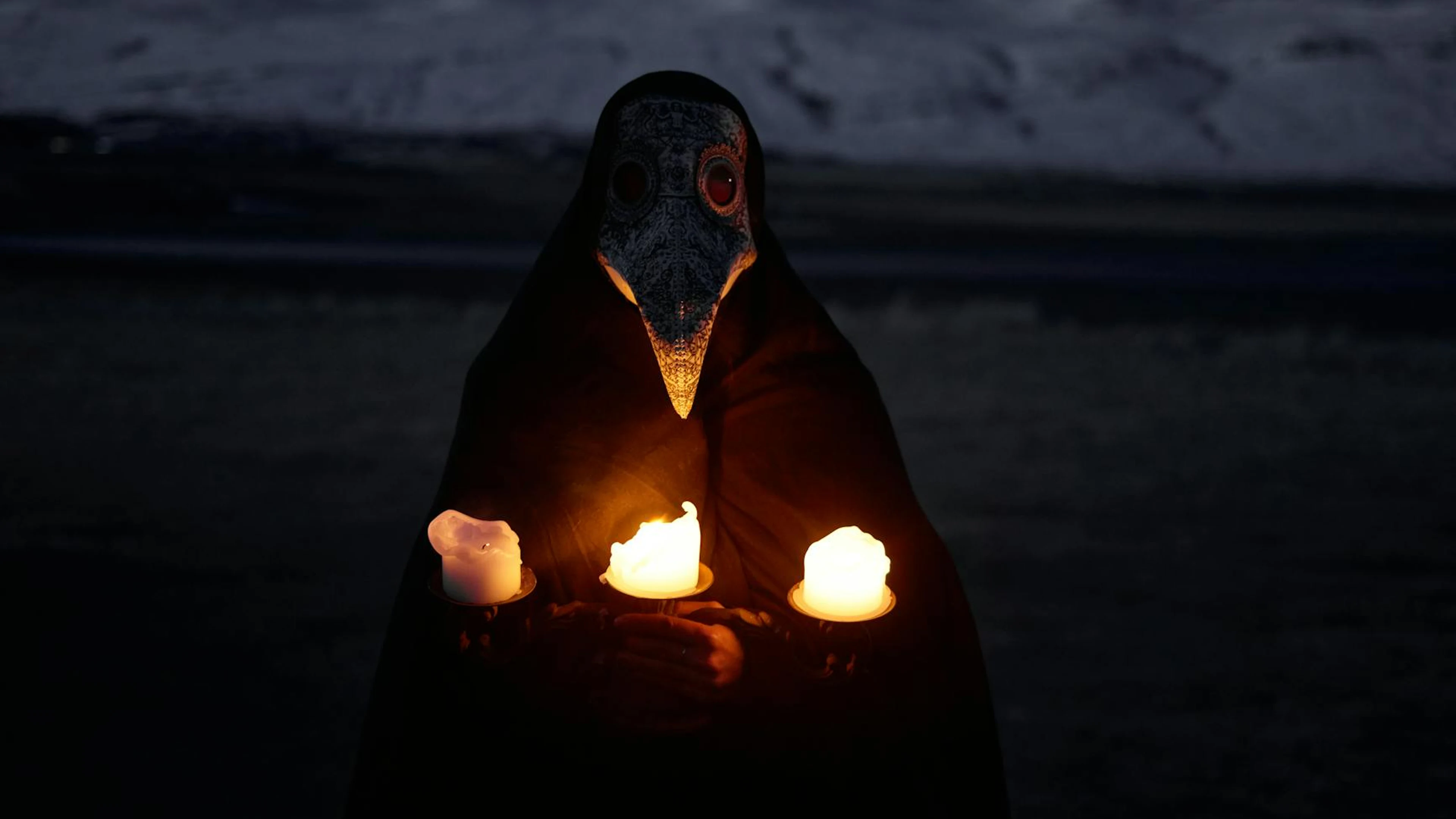 Download Unrecognizable person in plague mask standing in front of snowy hills at night a wallpaper for free. 3840x2160 4K Ultra HD resolution, perfect for your desktop. High quality dark wallpaper.
