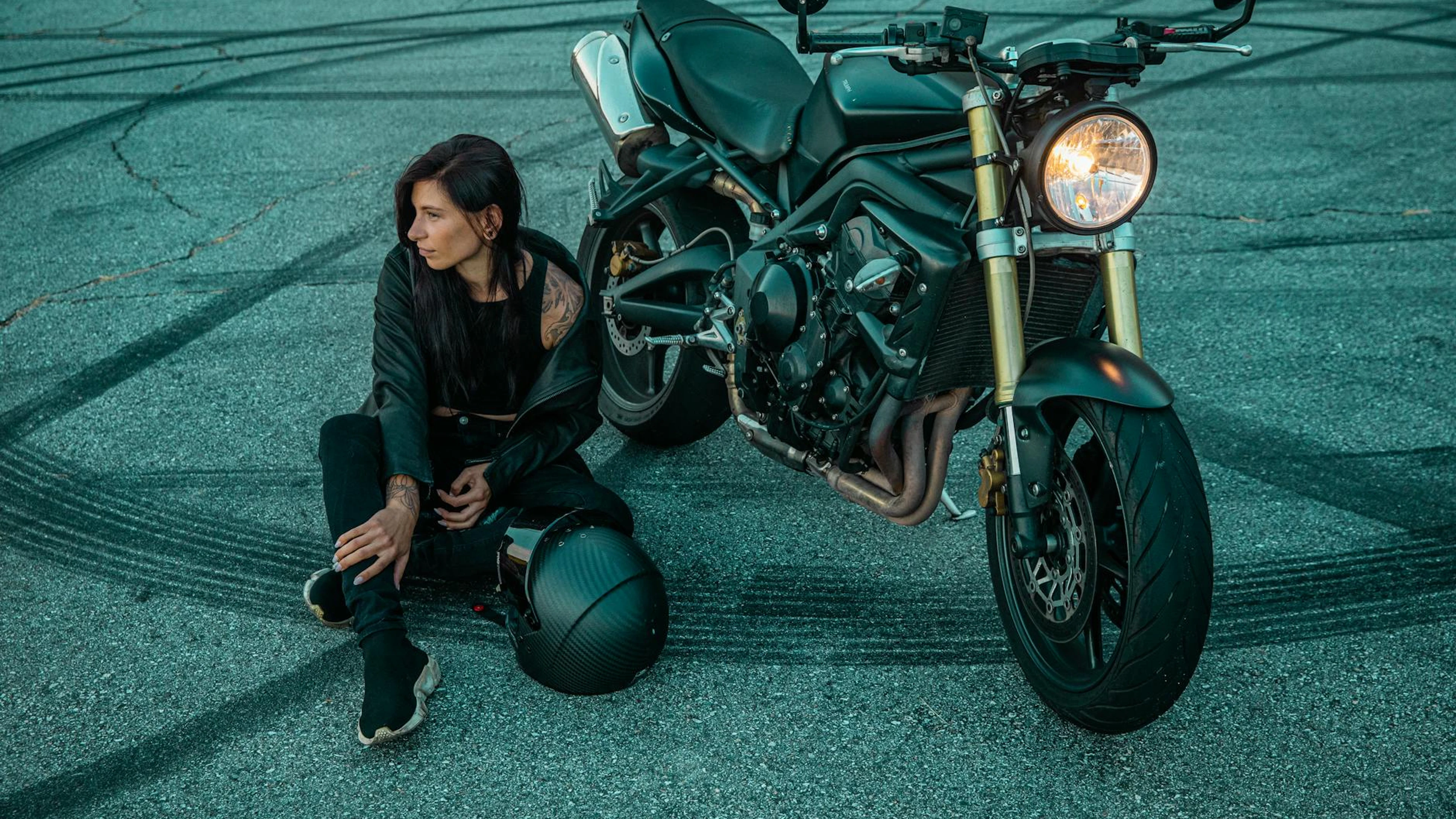Free Woman in black attire sits by motorcycle on road with skid marks. wallpaper in 4K Ultra HD resolution (3840x2160). Beautiful motorcycle background for your screen. No signup required.