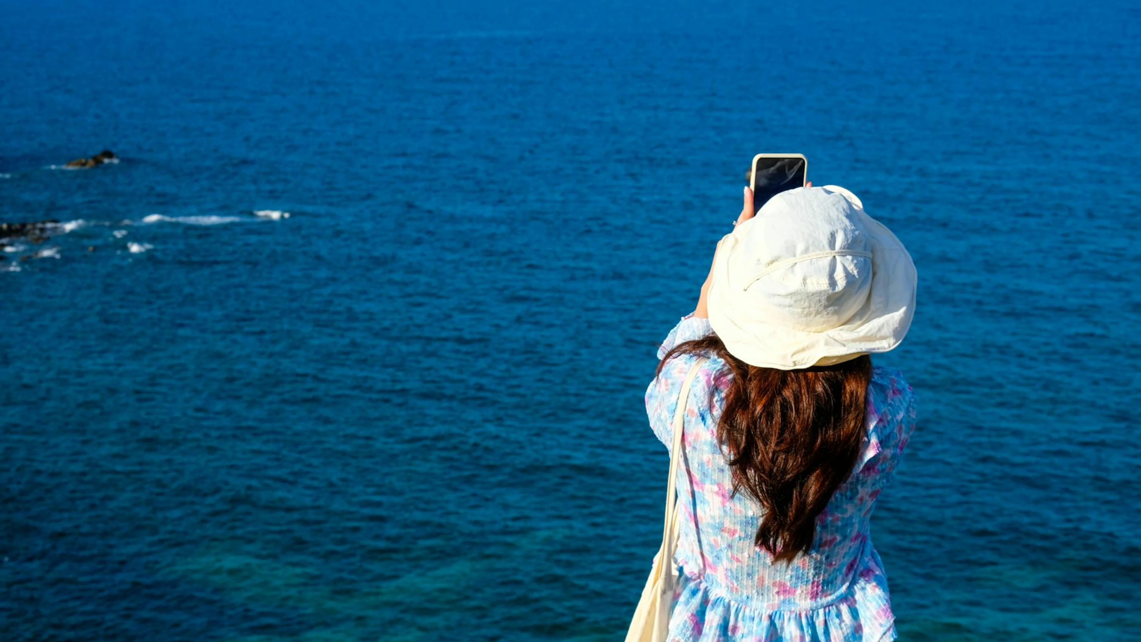 Download Woman in summer hat capturing the ocean view with a smartphone. wallpaper for free. 3840x2160 4K Ultra HD resolution, perfect for your desktop. High quality sunset wallpaper.