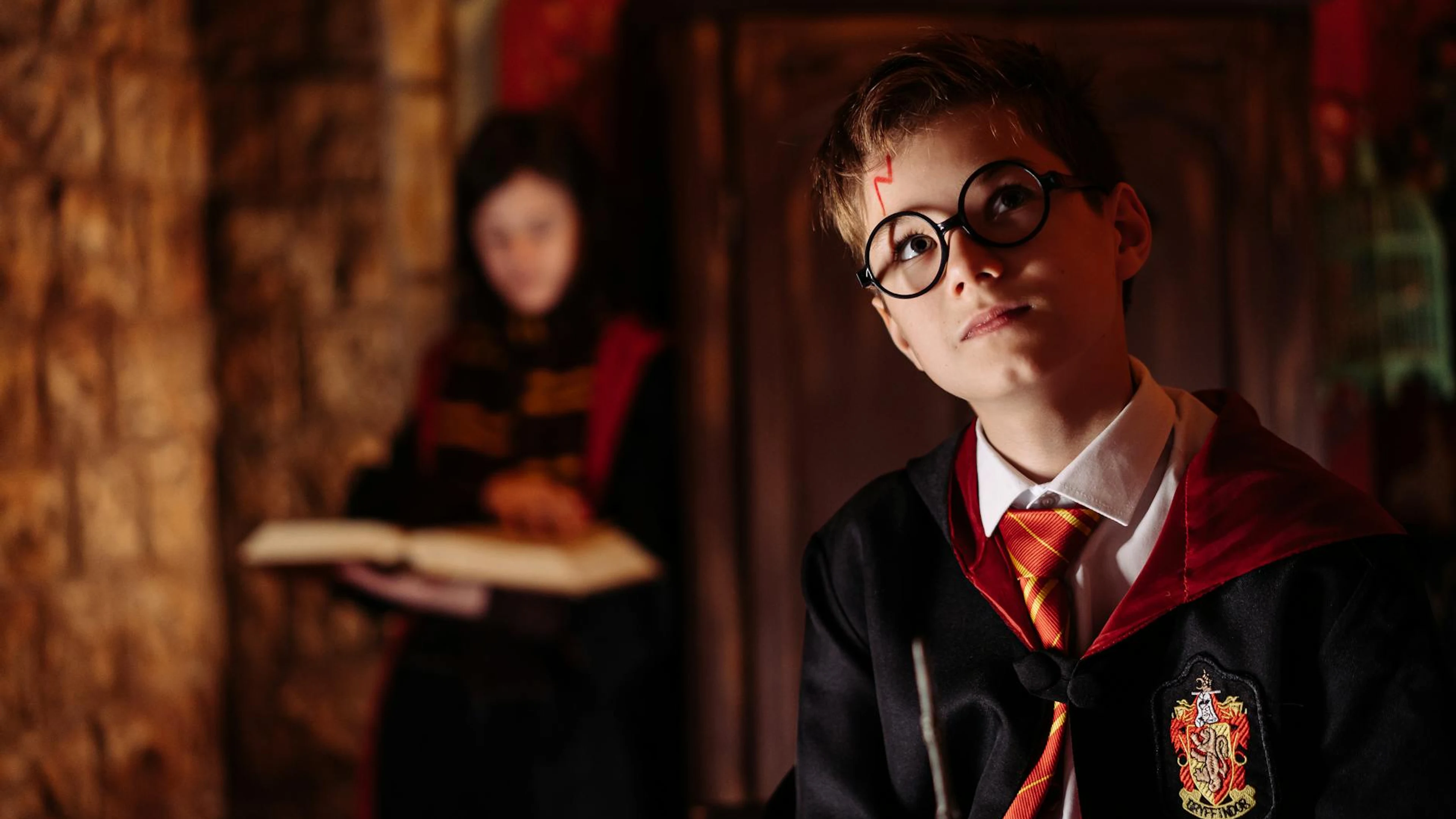 Free Young boy dressed as a wizard with a wand, engaging in fantasy role-play indoors wallpaper in 4K Ultra HD resolution (3840x2160). Beautiful fantasy background for your screen. No signup required.