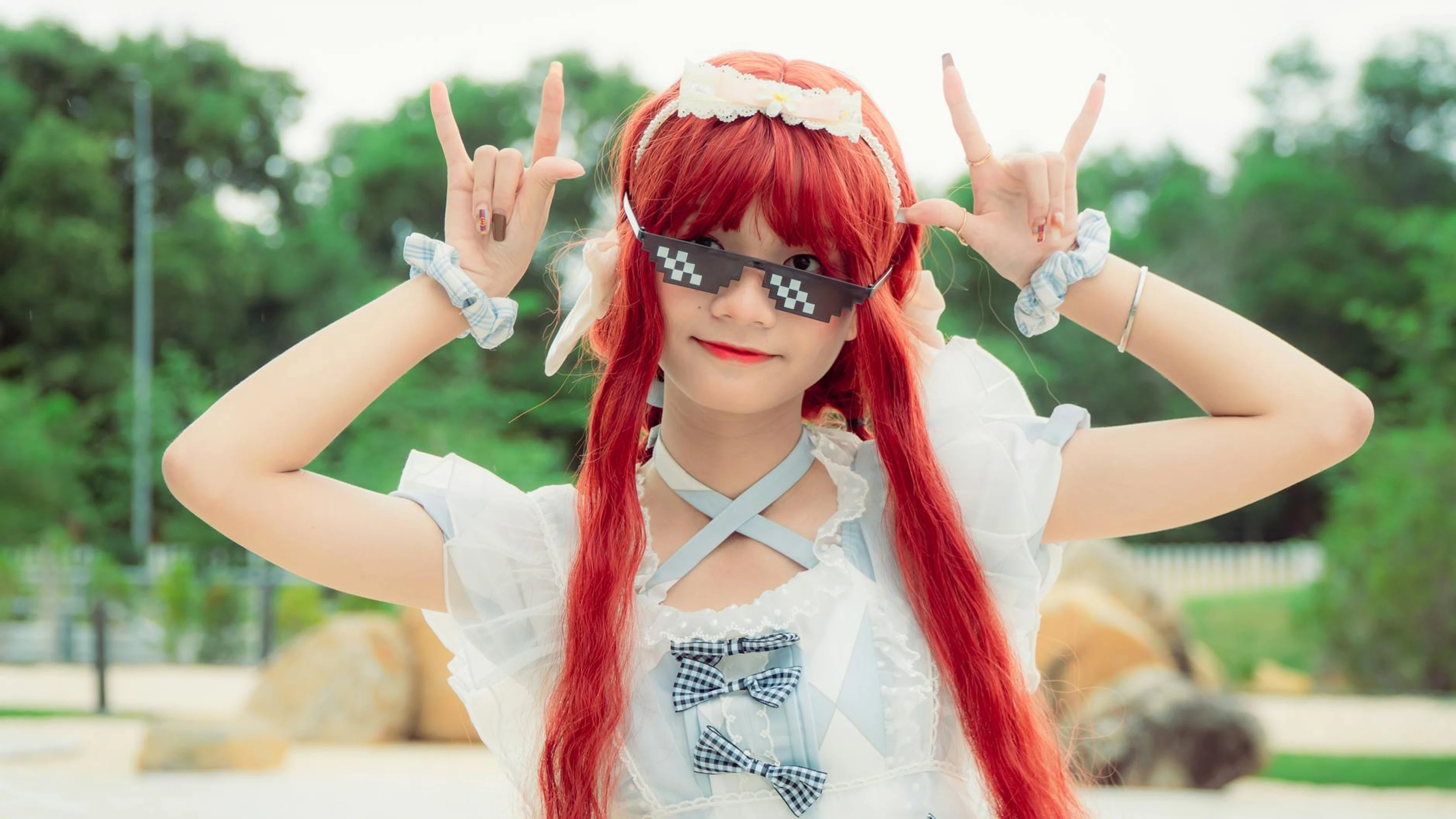 Download Young woman with red hair and pixel sunglasses in playful cosplay pose outdoors. wallpaper for free. 3840x2160 4K Ultra HD resolution, perfect for your desktop. High quality gaming wallpaper.