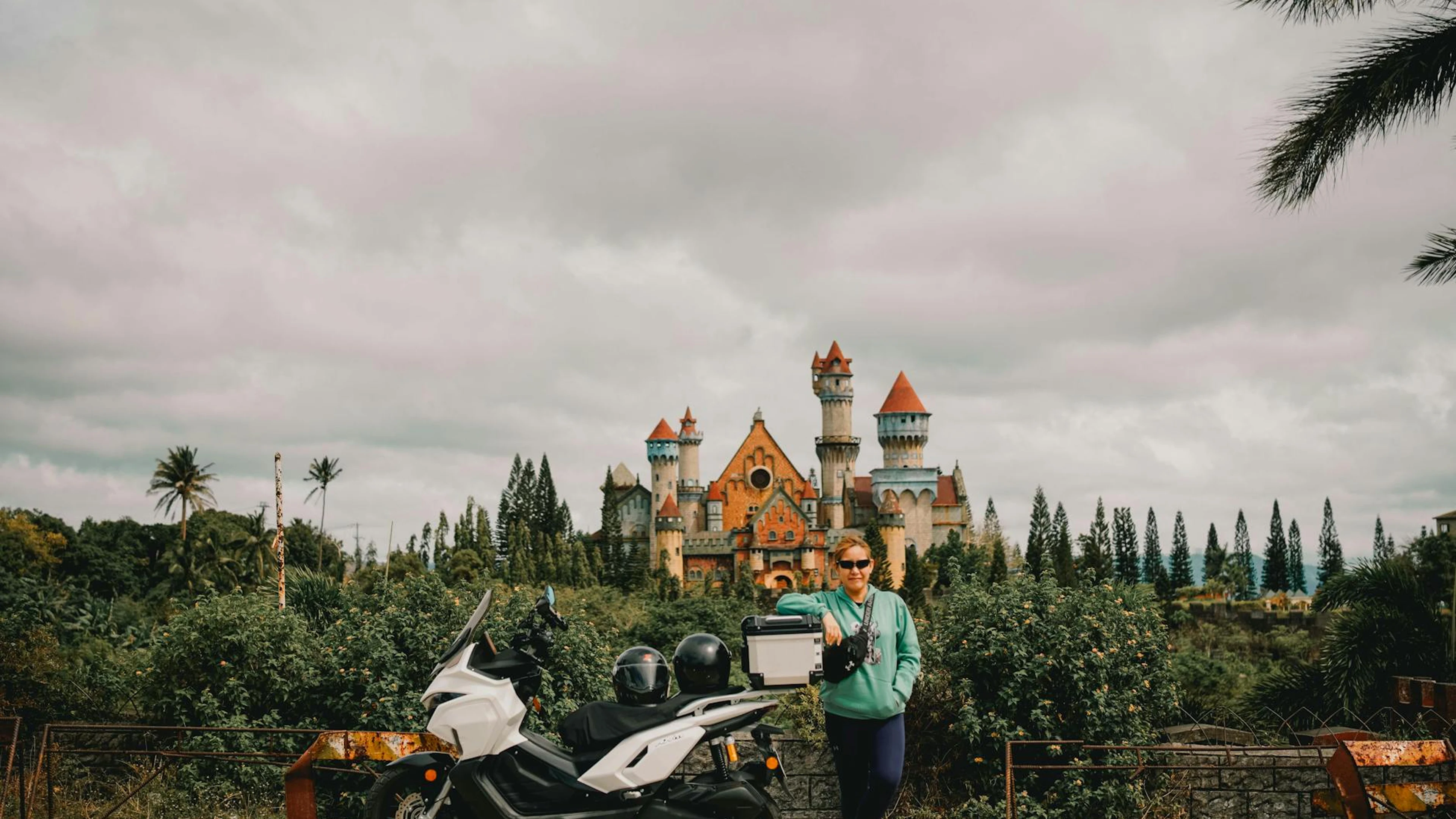 A person stands with a scooter before a castle-like structure surrounded by lush
