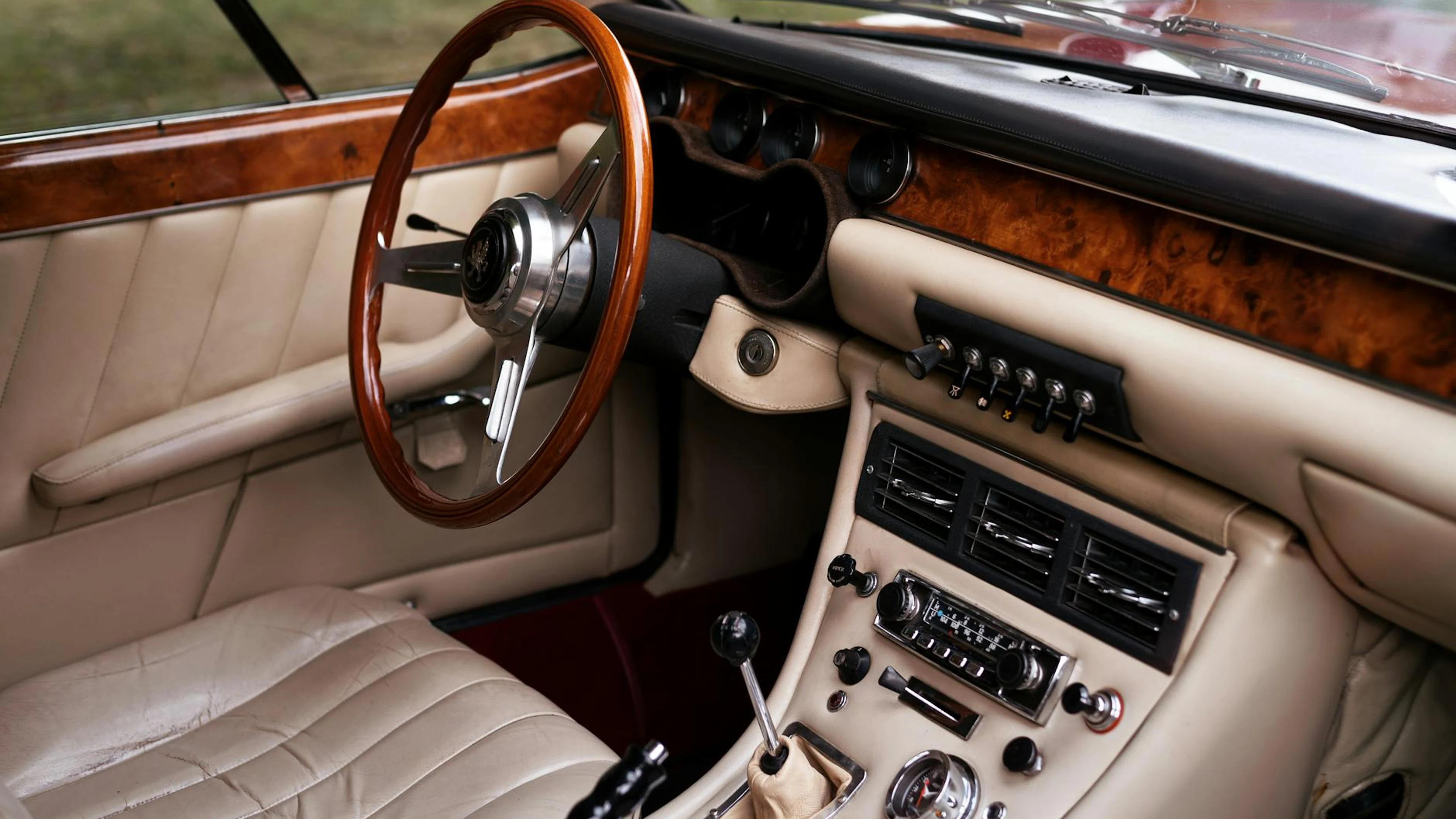 Close-up of a vintage car interior featuring wooden trim, leather upholstery, an