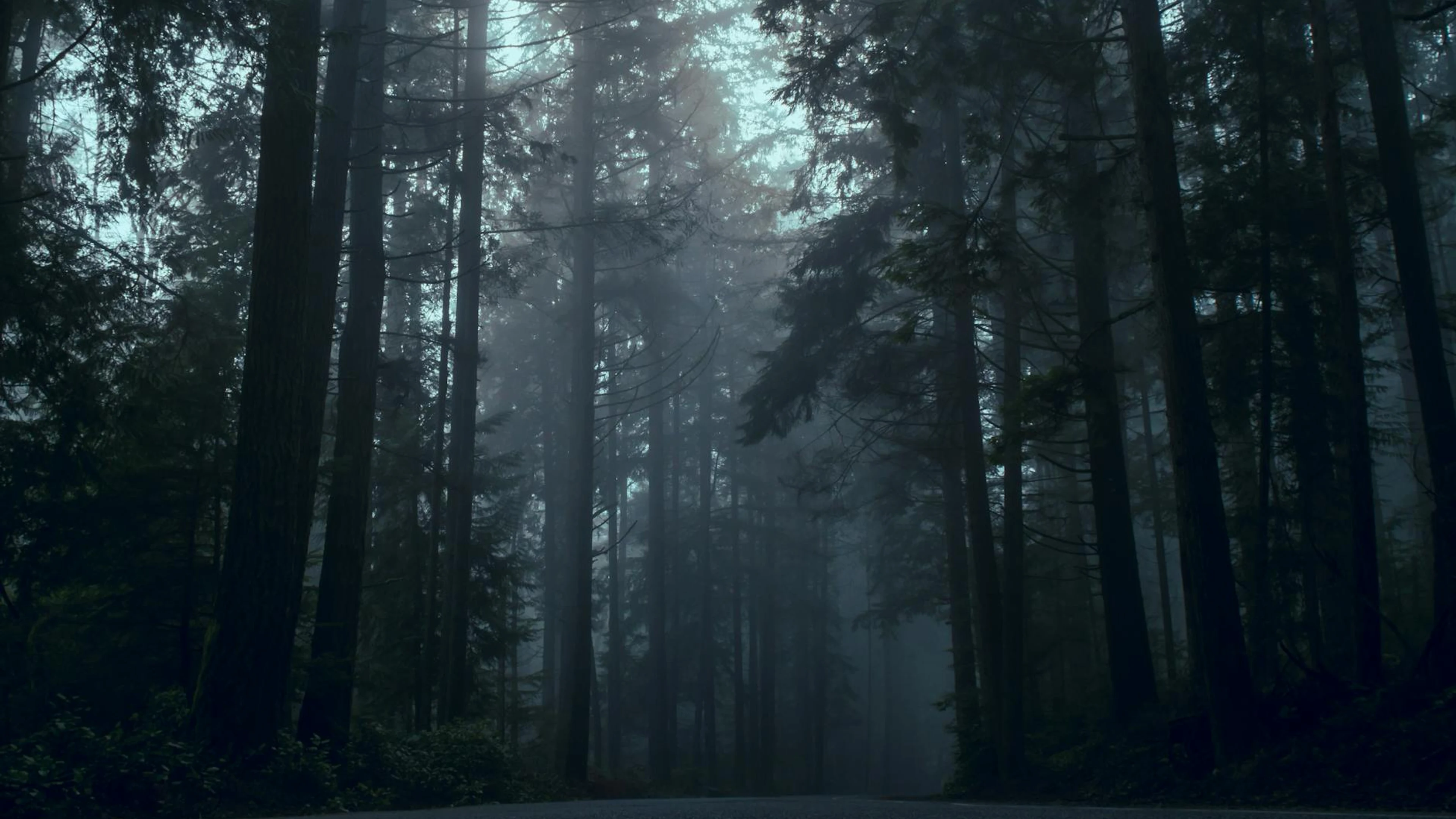 Download Moody forest scene with towering trees surrounded by dense fog at twilight wallpaper for free. 3840x2160 4K Ultra HD resolution, perfect for your desktop. High quality fantasy wallpaper.