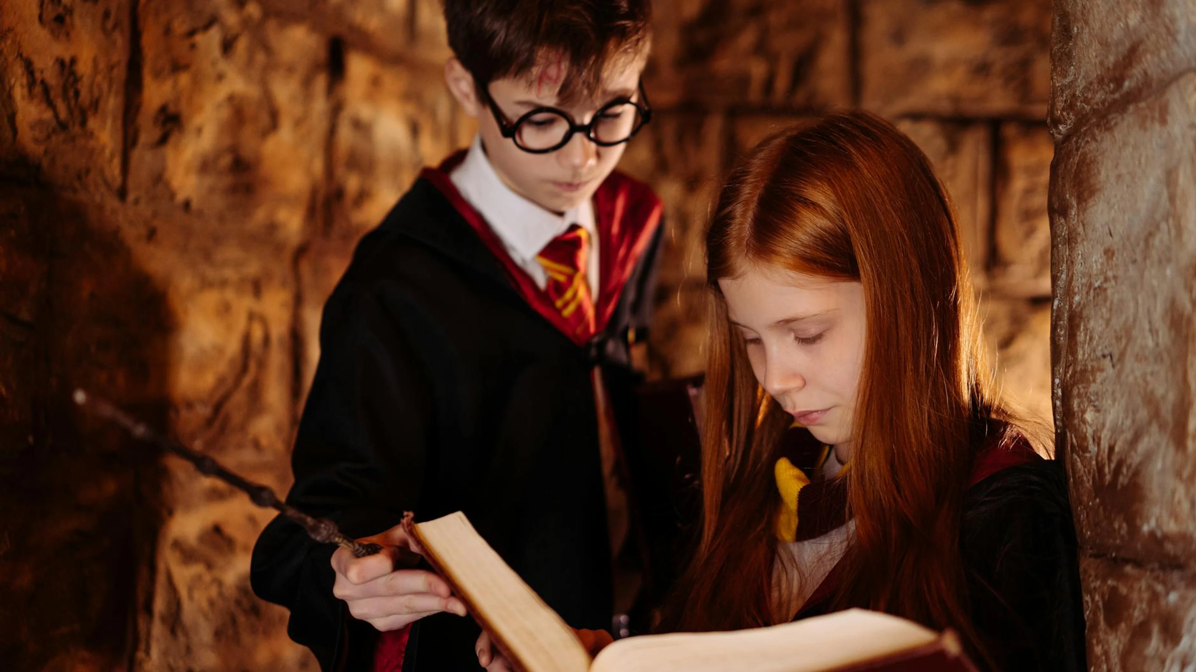 Two children in wizard costumes reading a spellbook in a dimly lit stone room.